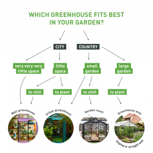 Dit schema helpt je in je zoektocht naar de juiste serre. Wat we je nog willen meegeven is: elke serre die je ziet kun je zelf omtoveren tot een tuinkamer. De urban serre en muurserre kun je evengoed in je gigantische tuin op het platteland zetten. Dacht je nu dat je in een tuinkamer geen planten kon zetten? Natuurlijk wel! Het is maar om je een duidelijk beeld te geven.