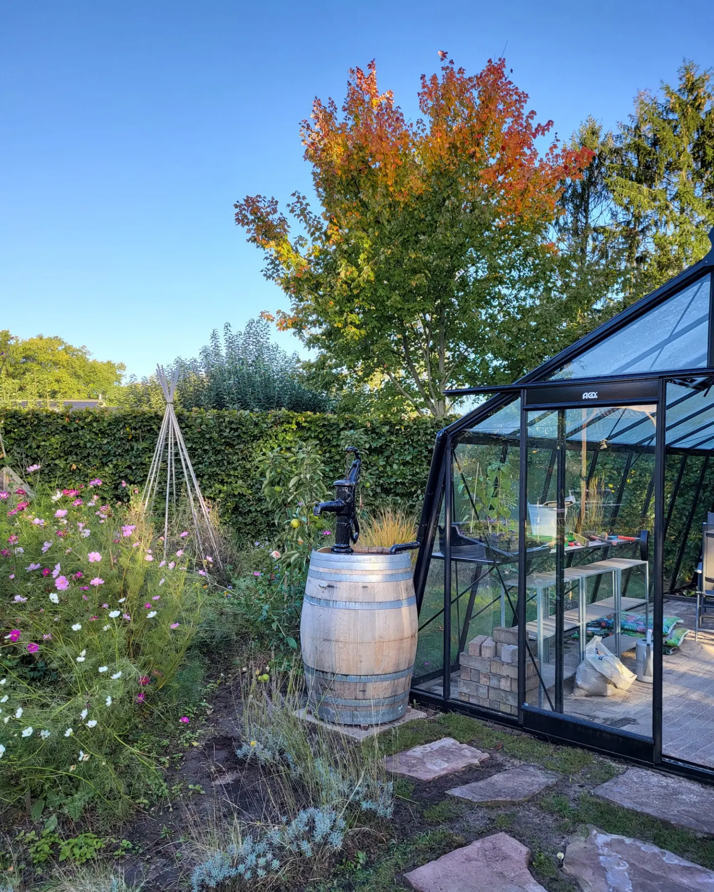 Op dit moment hebben we nog geen elektriciteit in de kas, maar dat gaan we wel aanleggen. Water is er al wel. We hebben de regenpijp van de kas aangesloten op een regenton en zo hebben we altijd water bij de hand. We hebben bewust gekozen voor een regenton van Rondomton met een karakteristieke uitstraling. Een mooie kas verdient een mooie regenton 😉
