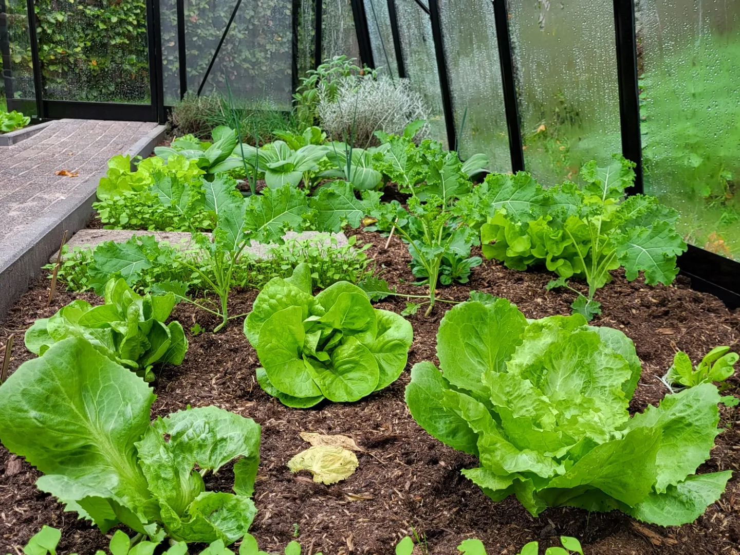 Langs de wanden groeien druiven. In het najaar kweek ik in de kas nog een aantal groentesoorten, die het in de moestuin niet meer doen op dat moment. Je kunt denken aan paksoi, andijvie en slasoorten. In de winter vind je in de kas onder andere nog de vaste kruidensoorten, winterpostelein en weeuwenteelt.