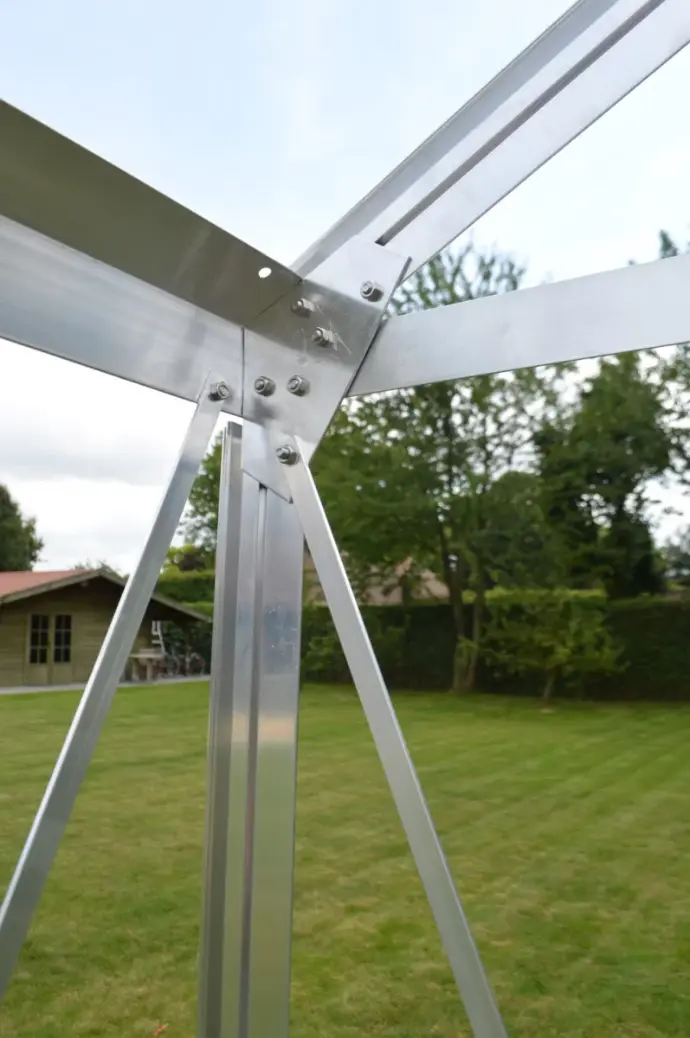 Dit onder de juiste spanning, zodat de serre standhoudt bij hevige windstoten. Zo blijft de serre haaks staan en wordt glasbreuk vermeden.
