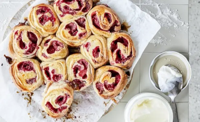 Recept afkomstig van lekker van bij ons: https://www.lekkervanbijons.be/recepten/rolls-met-framboos-en-yoghurt
